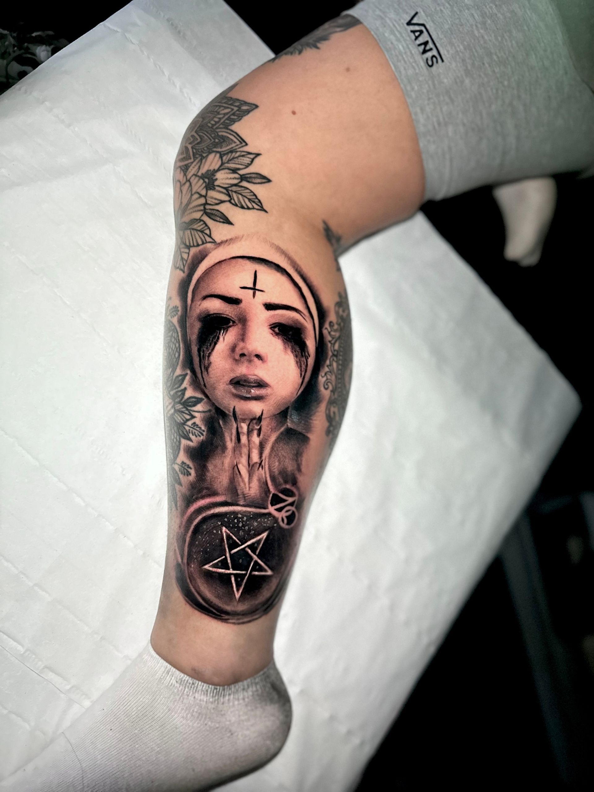 During lockdown I decided to take drawing up so I quit my job and drew 7/9 hours a day with the help of Nathan I started to progress. After 12 months of this I started my apprenticeship with inner darkness tattoos. Then moved on to being a junior artist.